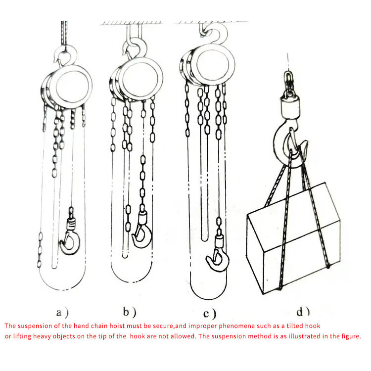 Larang Sekerasnya Lebih Muatan: Berat angkat tidak boleh melebihi beban berkadar (ditunjukkan pada papan nama). Jangan gunakan sebarang sumber kuasa selain daripada daya manual untuk menarik rantai.