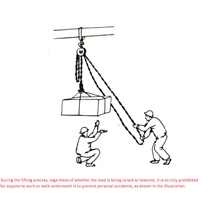 Tarik Betul: Tarik rantai tangan dengan lancar dan menegak di sepanjang arah rantai; jangan tarik pada sudut atau suruh ramai orang menarik dengan kuat.